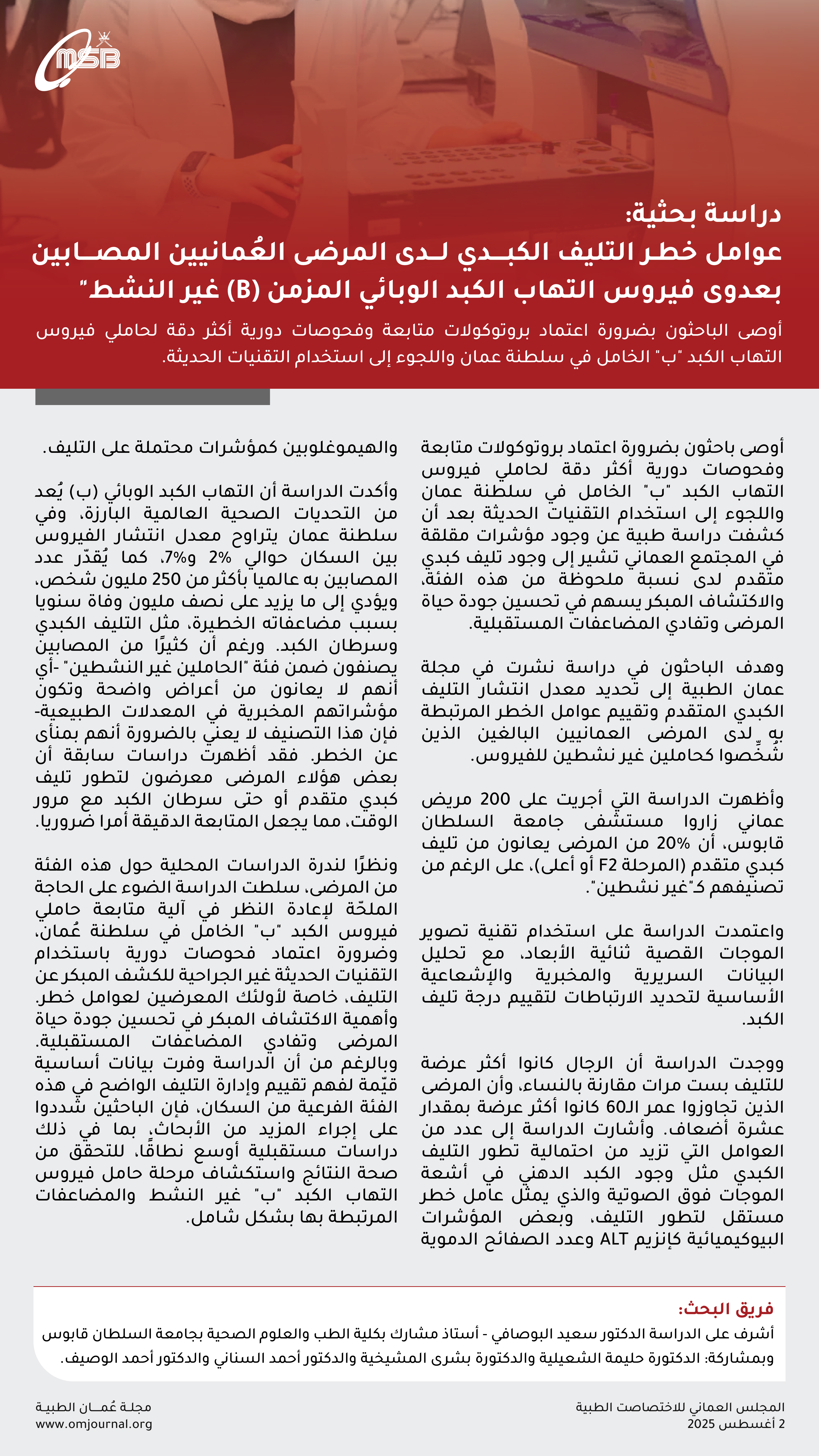 دراسة بحثية: عوامل خطر التليف الكبدي لدى المرضى العمانيين المصابين بعدوى فيروس التهاب الكبد الوبائي المزمن غير النشط